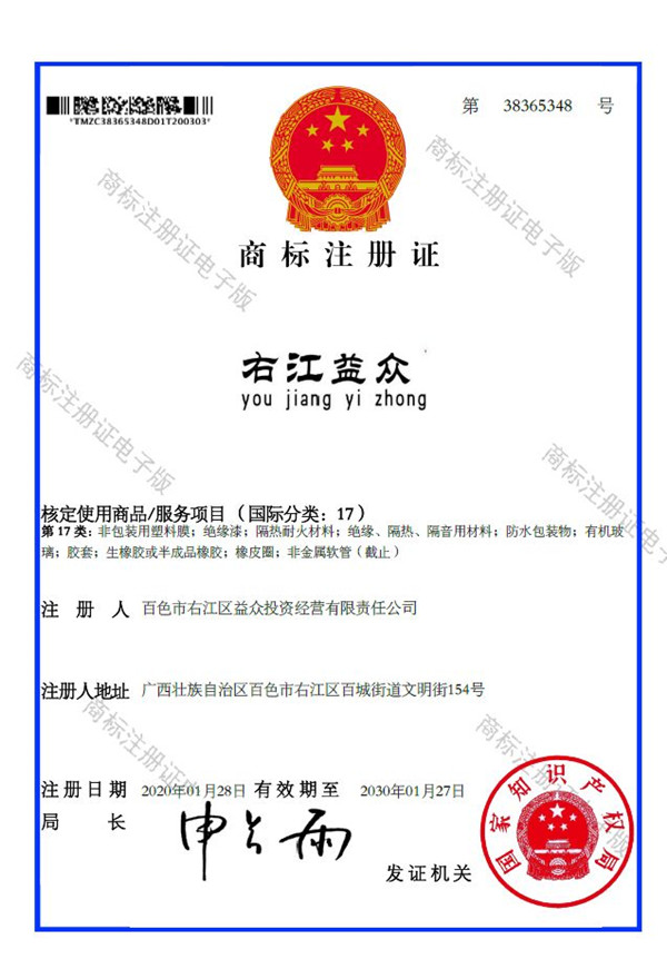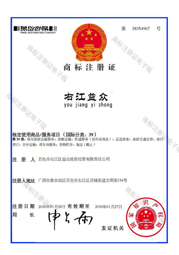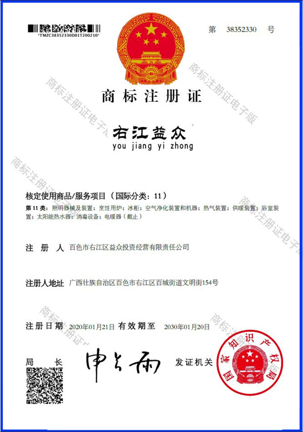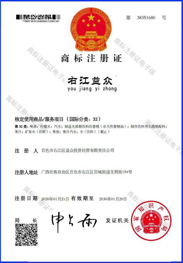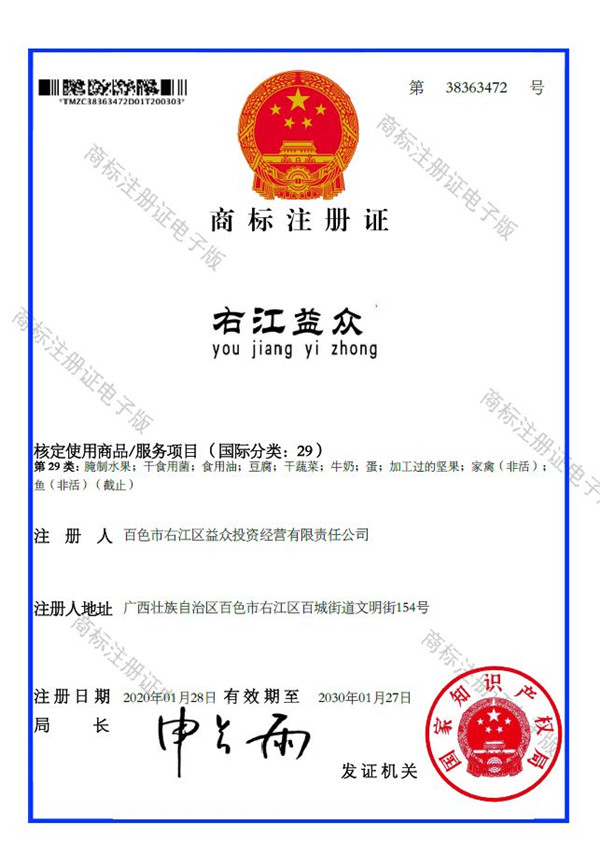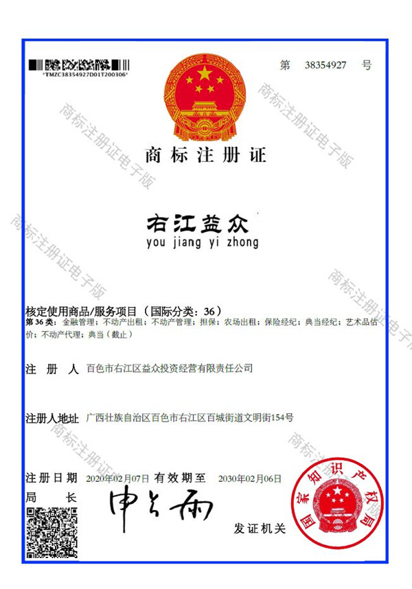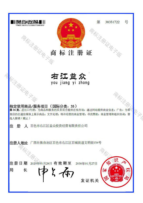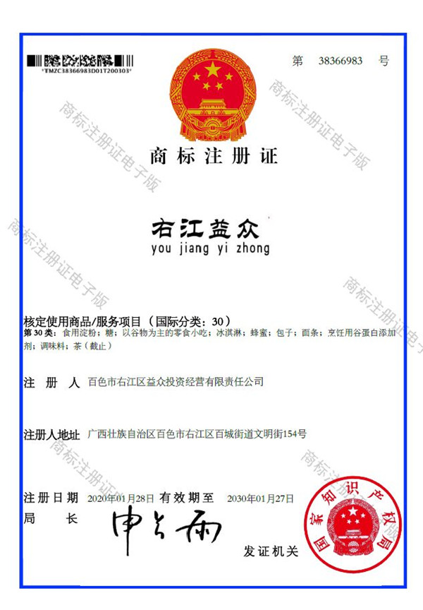 廣西百色益眾投資有限公司成功注冊“右江益眾”品牌商標(biāo)