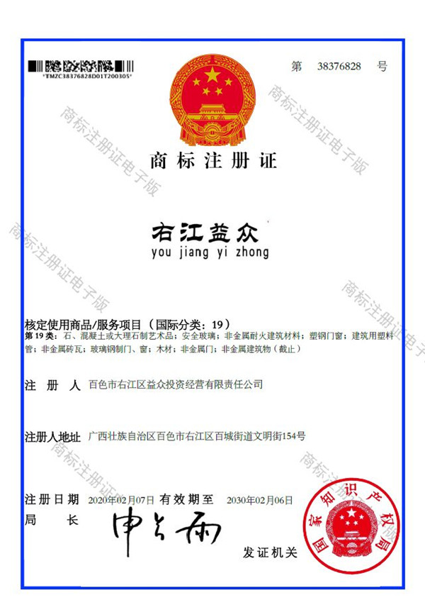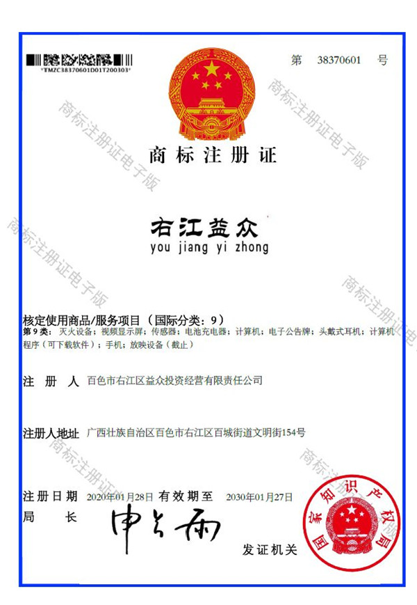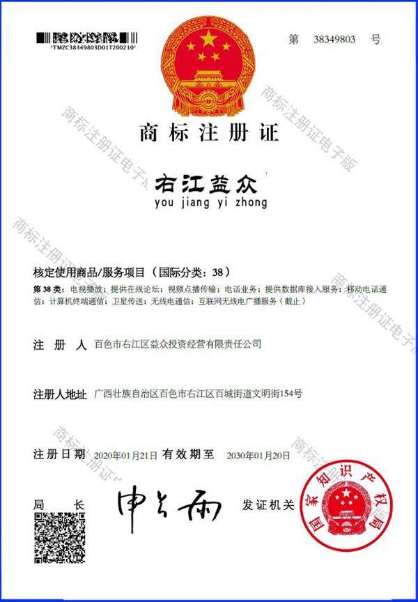 2019年4月,為樹立企業(yè)品牌形象,充分展現(xiàn)品牌價(jià)值,廣西百色益眾投資有限公司按照建設(shè)現(xiàn)代企業(yè)的方向和標(biāo)準(zhǔn),啟動品牌商標(biāo)注冊申報(bào)工作,經(jīng)過6個(gè)月的審核期和3個(gè)月的公告期,“右江益眾”45個(gè)大類商標(biāo)品牌第一時(shí)間成功獲批?!坝医姹姟逼放频某晒ψ?,有利于公司更好地參與市場競爭,同時(shí),對于強(qiáng)化企業(yè)內(nèi)部管理、樹立良好的企業(yè)形象、提升公司美譽(yù)度也可起到積極的助推作用。
