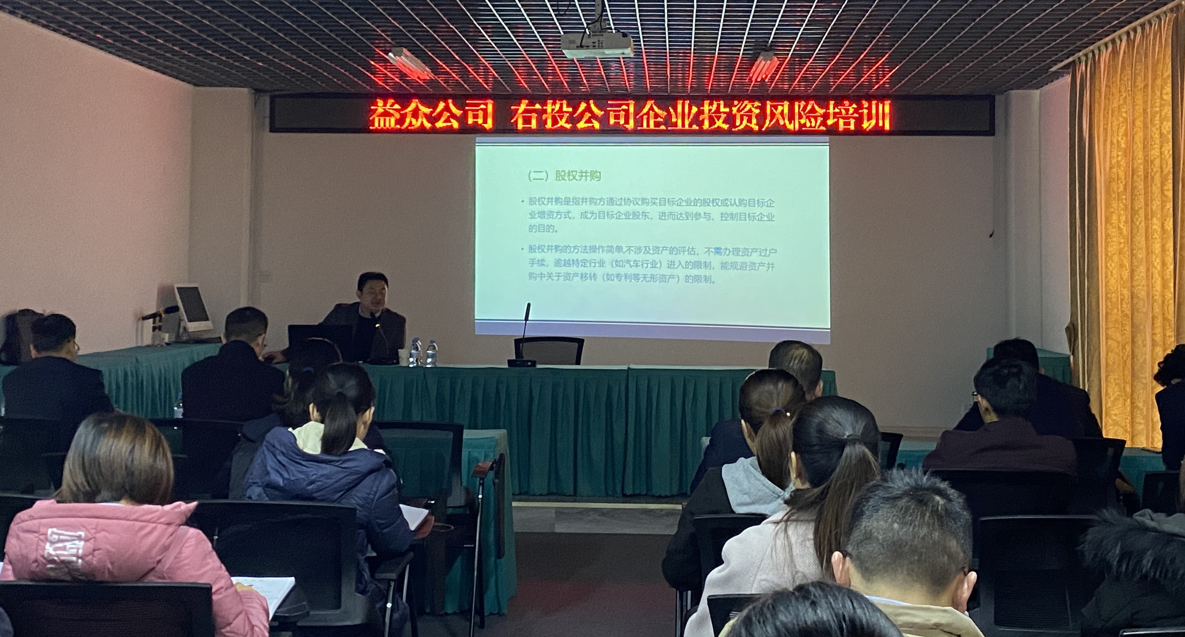 ????????為讓公司管理人員熟悉掌握企業(yè)投資風(fēng)險(xiǎn)防控和新發(fā)布的《民法典》有關(guān)知識(shí),提高公司投資風(fēng)險(xiǎn)防控的實(shí)操能力,降低企業(yè)法律風(fēng)險(xiǎn),近日,益眾公司在老鄉(xiāng)家園辦公區(qū)(益眾·尚城商業(yè)樓B1#三樓)會(huì)議室舉辦企業(yè)投資風(fēng)險(xiǎn)培訓(xùn)。培訓(xùn)邀請(qǐng)廣西同望律師事務(wù)所陸譽(yù)中律師主講,公司各部門、子公司負(fù)責(zé)人及有關(guān)人員約40多人參加培訓(xùn)。