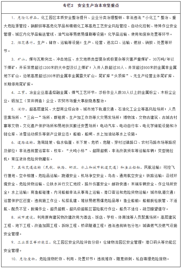 深化專項(xiàng)整治。深入推進(jìn)危險(xiǎn)化學(xué)品、礦山、消防、交通運(yùn)輸、建筑施工、民爆、特種設(shè)備、大型商業(yè)綜合體等重點(diǎn)行業(yè)領(lǐng)域安全整治,解決影響制約安全生產(chǎn)的薄弱環(huán)節(jié)和突出問題,督促企業(yè)嚴(yán)格安全管理、加大安全投入、落實(shí)風(fēng)險(xiǎn)管控措施。結(jié)合深化供給側(cè)結(jié)構(gòu)性改革,推動(dòng)安全基礎(chǔ)薄弱、安全保障能力低下且整改后仍不達(dá)標(biāo)的企業(yè)退出市場(chǎng)。統(tǒng)籌考慮危險(xiǎn)化學(xué)品企業(yè)搬遷和項(xiàng)目建設(shè)審批,優(yōu)先保障符合條件企業(yè)的搬遷用地。持續(xù)推進(jìn)企業(yè)安全生產(chǎn)標(biāo)準(zhǔn)化建設(shè),實(shí)現(xiàn)安全管理、操作行為、設(shè)施設(shè)備和作業(yè)環(huán)境規(guī)范化。推動(dòng)淘汰落后技術(shù)、工藝、材料和設(shè)備,加大重點(diǎn)設(shè)施設(shè)備、儀器儀表檢驗(yàn)檢測(cè)力度。推動(dòng)各類金融機(jī)構(gòu)出臺(tái)優(yōu)惠貸款等金融類產(chǎn)品,大力推廣新技術(shù)、新工藝、新材料和新裝備,實(shí)施智能化礦山、智能化工廠、數(shù)字化車間改造,開展智能化作業(yè)和危險(xiǎn)崗位機(jī)器人替代示范。強(qiáng)化危險(xiǎn)廢物全過程監(jiān)管,動(dòng)態(tài)修訂《國家危險(xiǎn)廢物名錄》,修訂危險(xiǎn)廢物鑒別、貯存以及水泥窯協(xié)同處置污染控制等標(biāo)準(zhǔn),制定完善危險(xiǎn)廢物重點(diǎn)監(jiān)管單位清單。建立廢棄危險(xiǎn)化學(xué)品等危險(xiǎn)廢物監(jiān)管協(xié)作和聯(lián)合執(zhí)法工作機(jī)制,加強(qiáng)危險(xiǎn)廢物監(jiān)管能力與應(yīng)急處置技術(shù)支持能力建設(shè)。